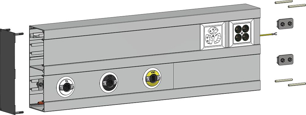 Te gebruiken als medische verzorgingsunit horizontaal vervaardigd uit aluminium profiel 2,2mm 2 regels in het midden gescheiden aan de onderzijde met 5 st. ø 9 gaten voor gasafvoer met combinatierails voor montage van de installatieapparatuur inclusief aansluitmateriaal en aarddraad Kleur: RAL 9010 Puur wit Lengte: 2000mm